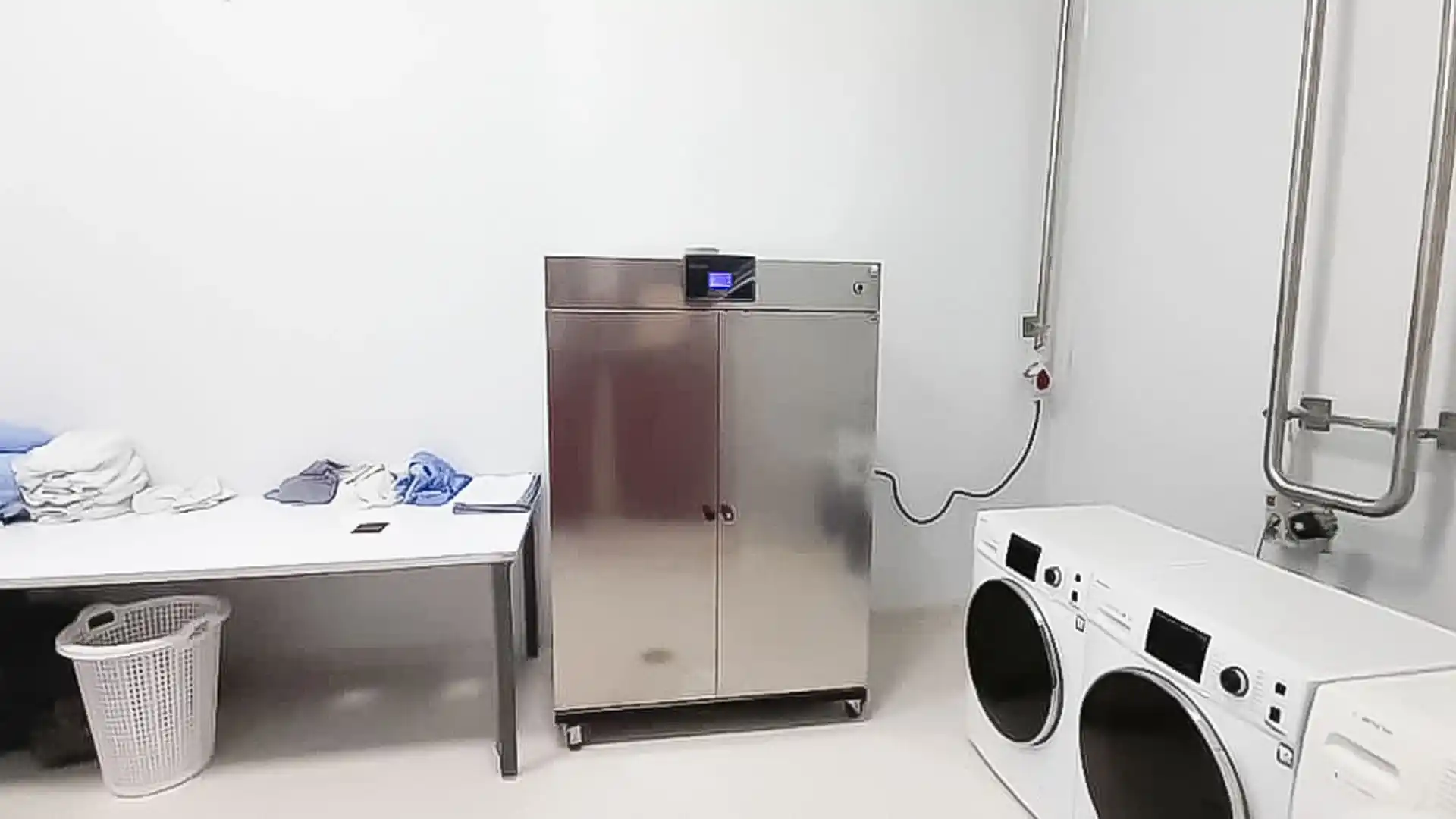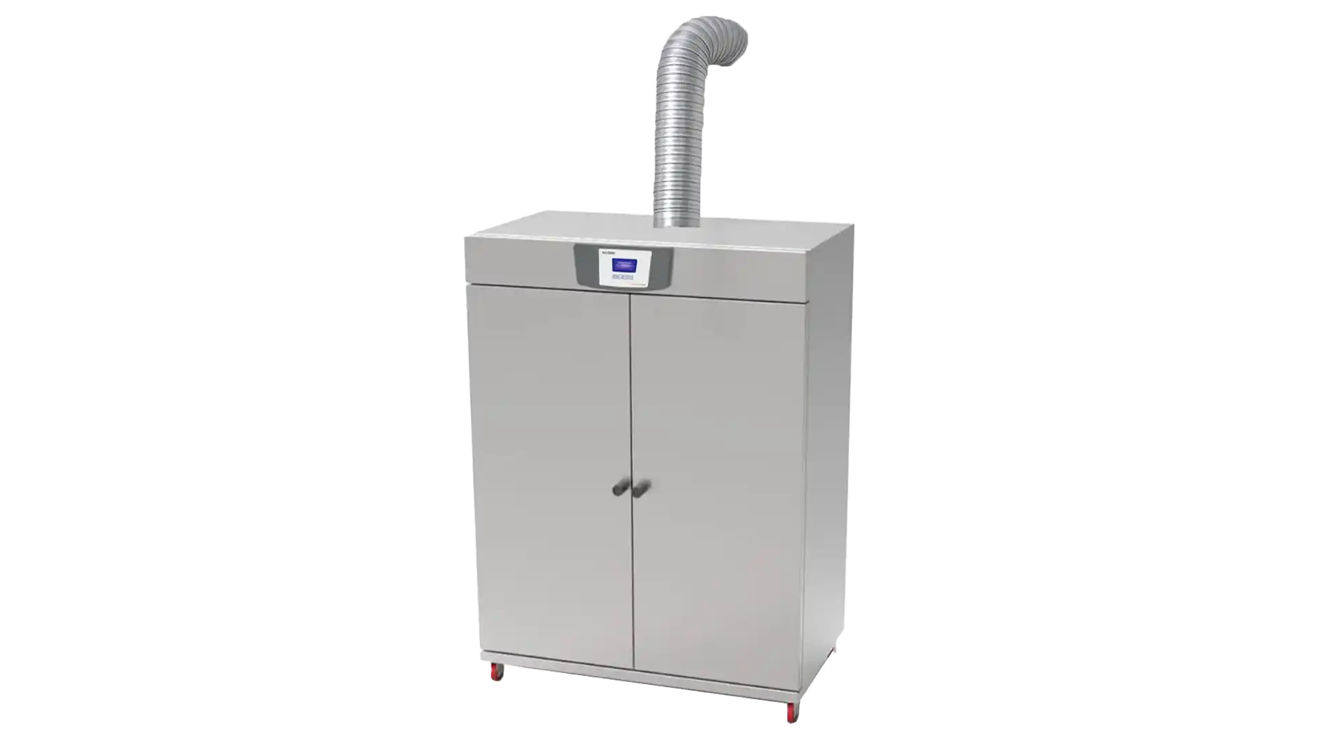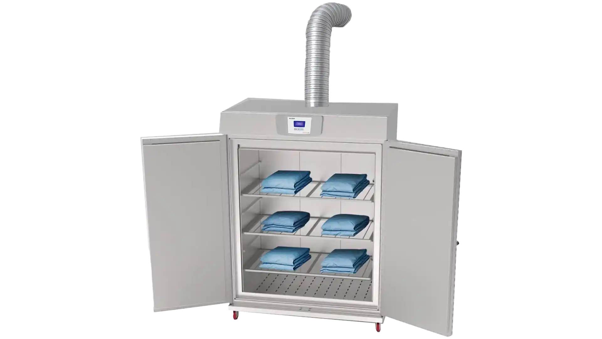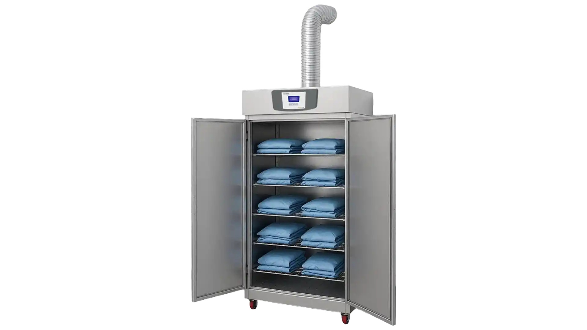 دمش هوای تازه و فیلتر شده توسط فن ها از قسمت کف محفظه به داخل و خروج هوا از یک دریچه یا کانال سقفی در سقف دستگاه باعث تسریع فرآیند خشک شدن البسه می گردد.